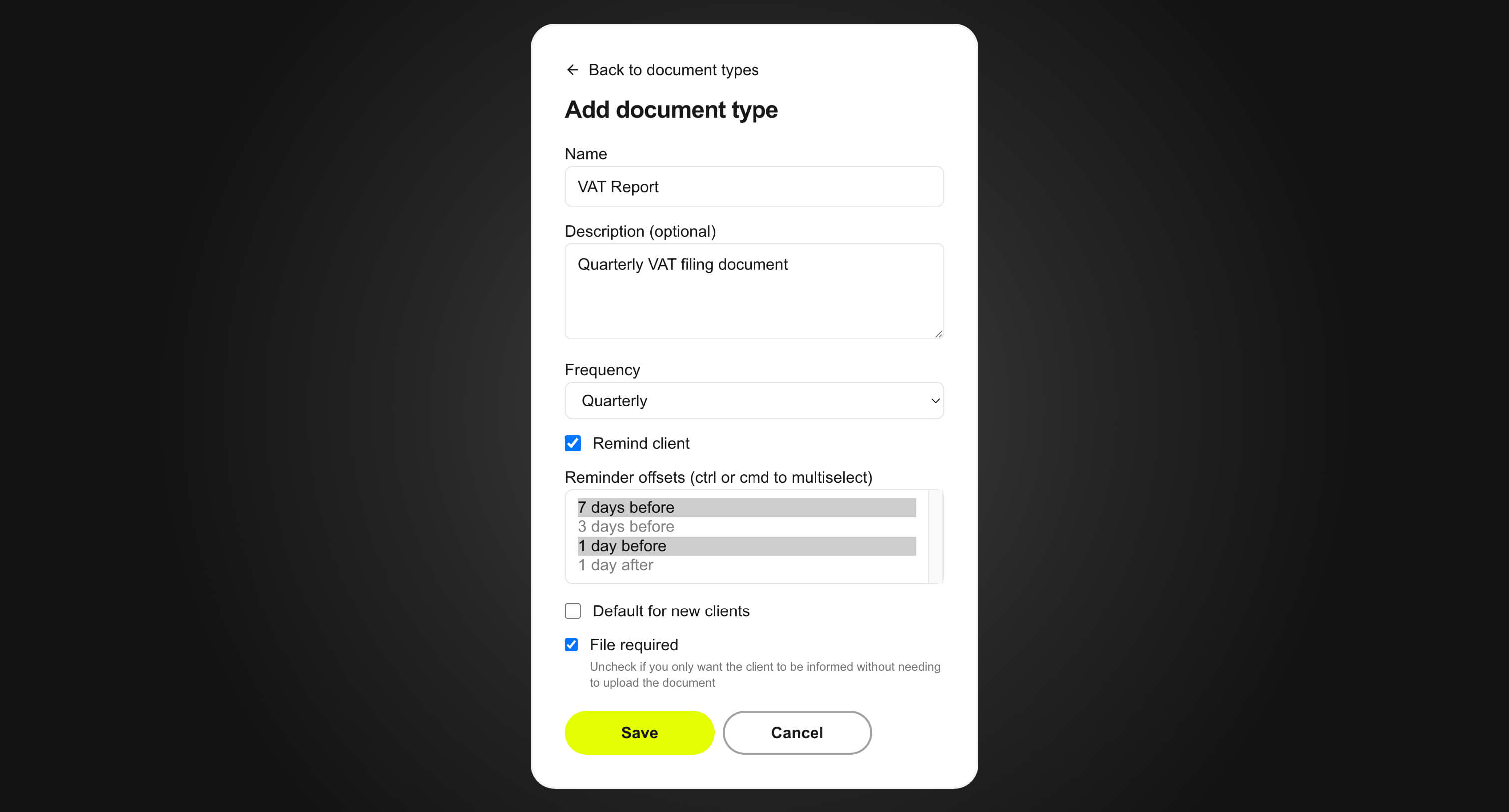 Define a reusable document type with clear requirements so every client submits the same file format.